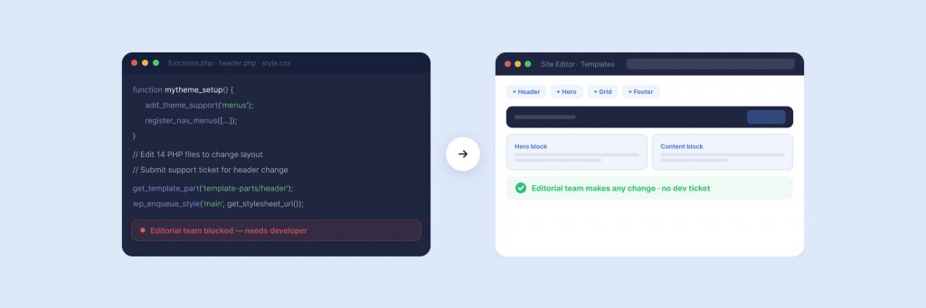 This is the change that matters most operationally. When every structural change requires developer involvement, content velocity is gated by sprint capacity. FSE doesn’t eliminate the need for developers — complex functionality, custom blocks, and integrations still require engineering. But it does remove developers from the critical path for the routine template and layout changes that previously consumed a disproportionate share of their time.