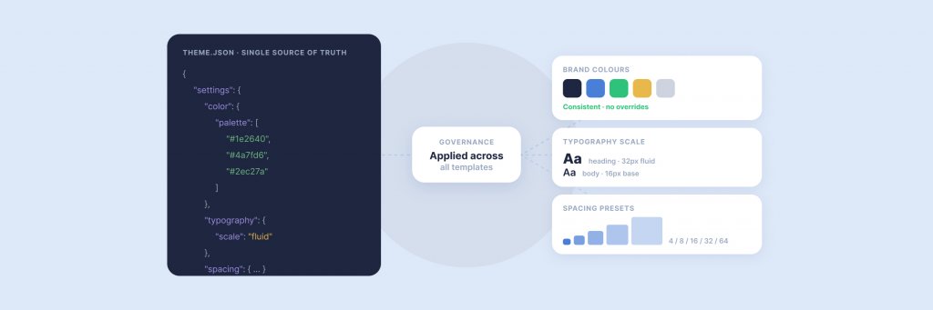 For organisations operating under strict brand guidelines — financial services, healthcare, regulated industries — this level of guardrail was previously achievable only through expensive DXP platforms like Optimizely or Sitecore, or through heavily customised WordPress admin interfaces. theme.json delivers it natively, without additional plugins or development overhead.