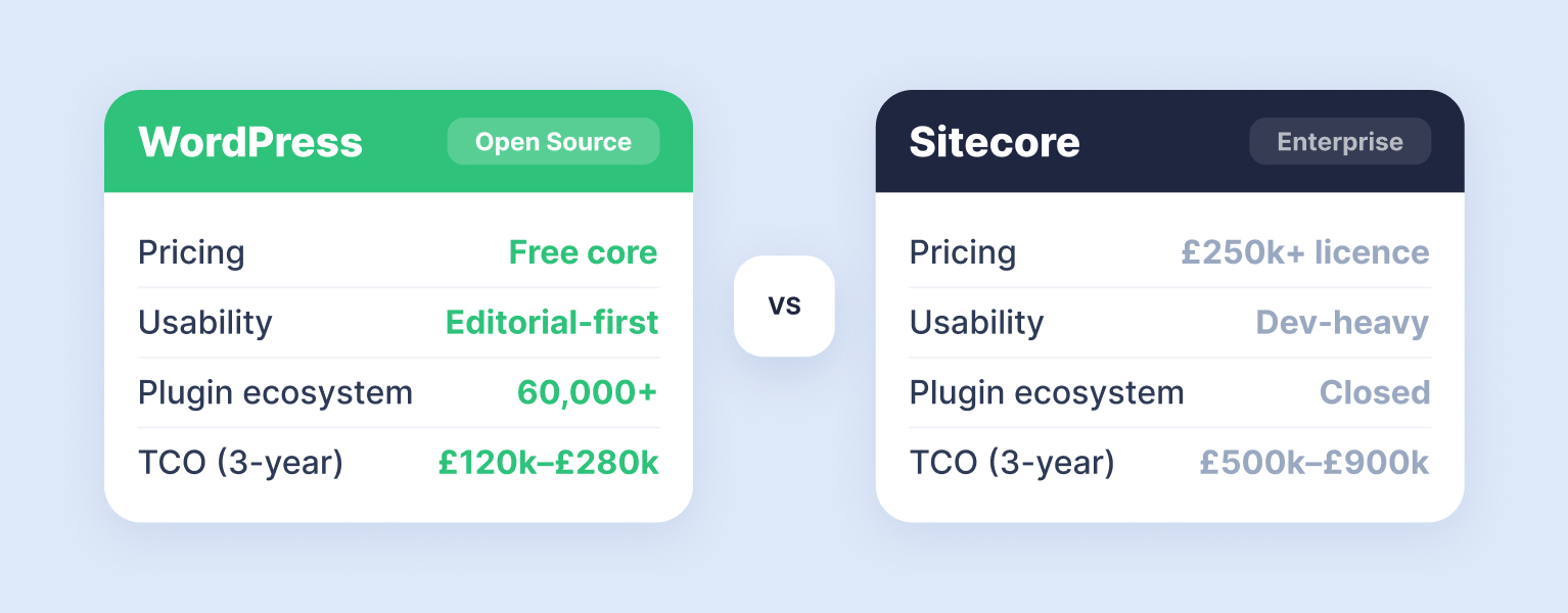 Considering your CMS options? We compare WordPress and Sitecore across pricing, usability, security, and scalability to help you choose the right platform.