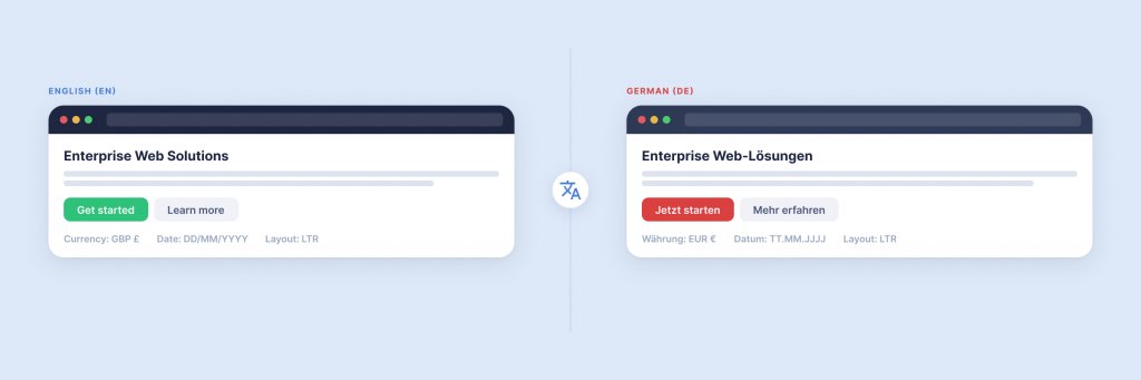 Translation changes the length of text — often dramatically. German words are typically 30% longer than their English equivalents. A navigation label that fits neatly in English might overflow in German. A call-to-action button that works in English might need two lines in French. These are not edge cases; they are certainties that need to be designed for from the start.
